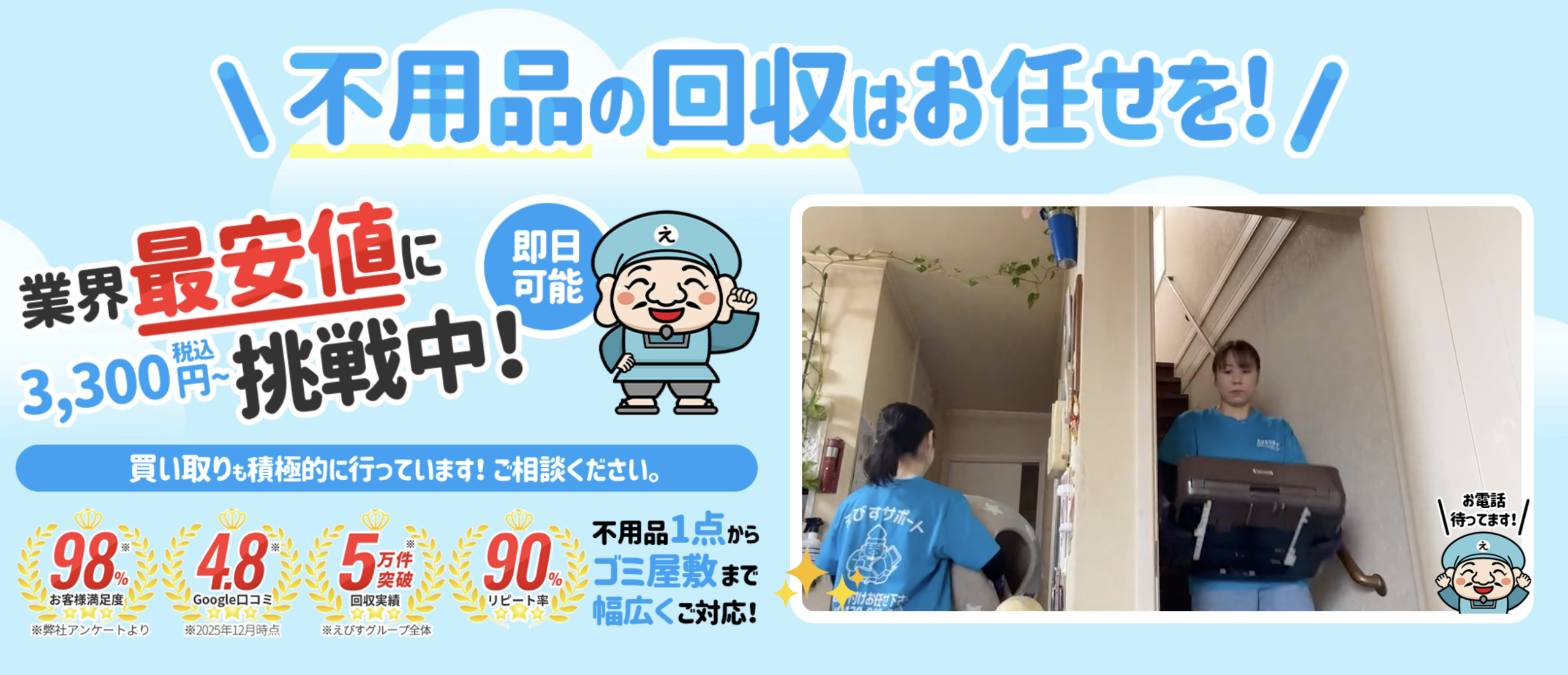 えびすサポート広島は、広島市を拠点に中国地方全域で不用品回収・買取サービスを展開している地域密着型の業者です。