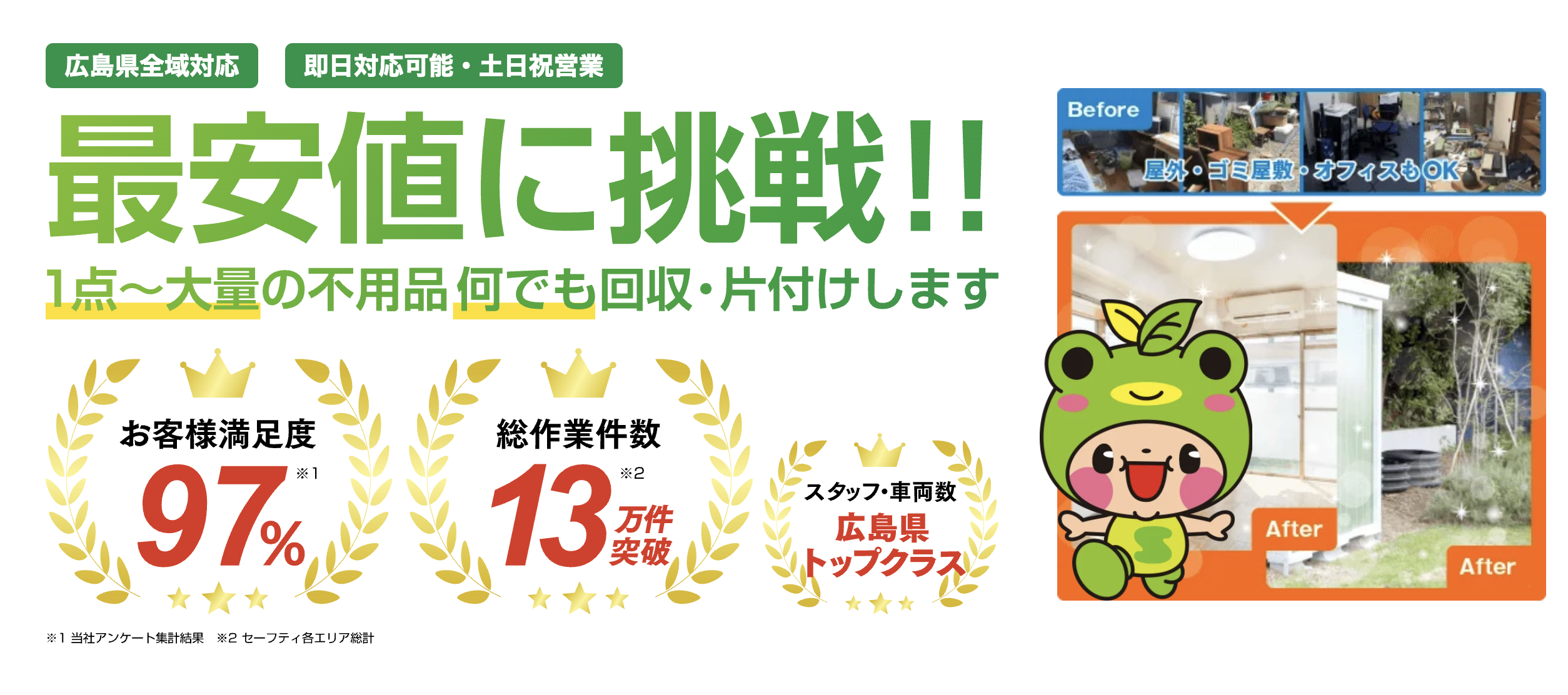 セーフティ広島は、広島県全域に対応する不用品回収・大型ゴミ処分の専門業者です。