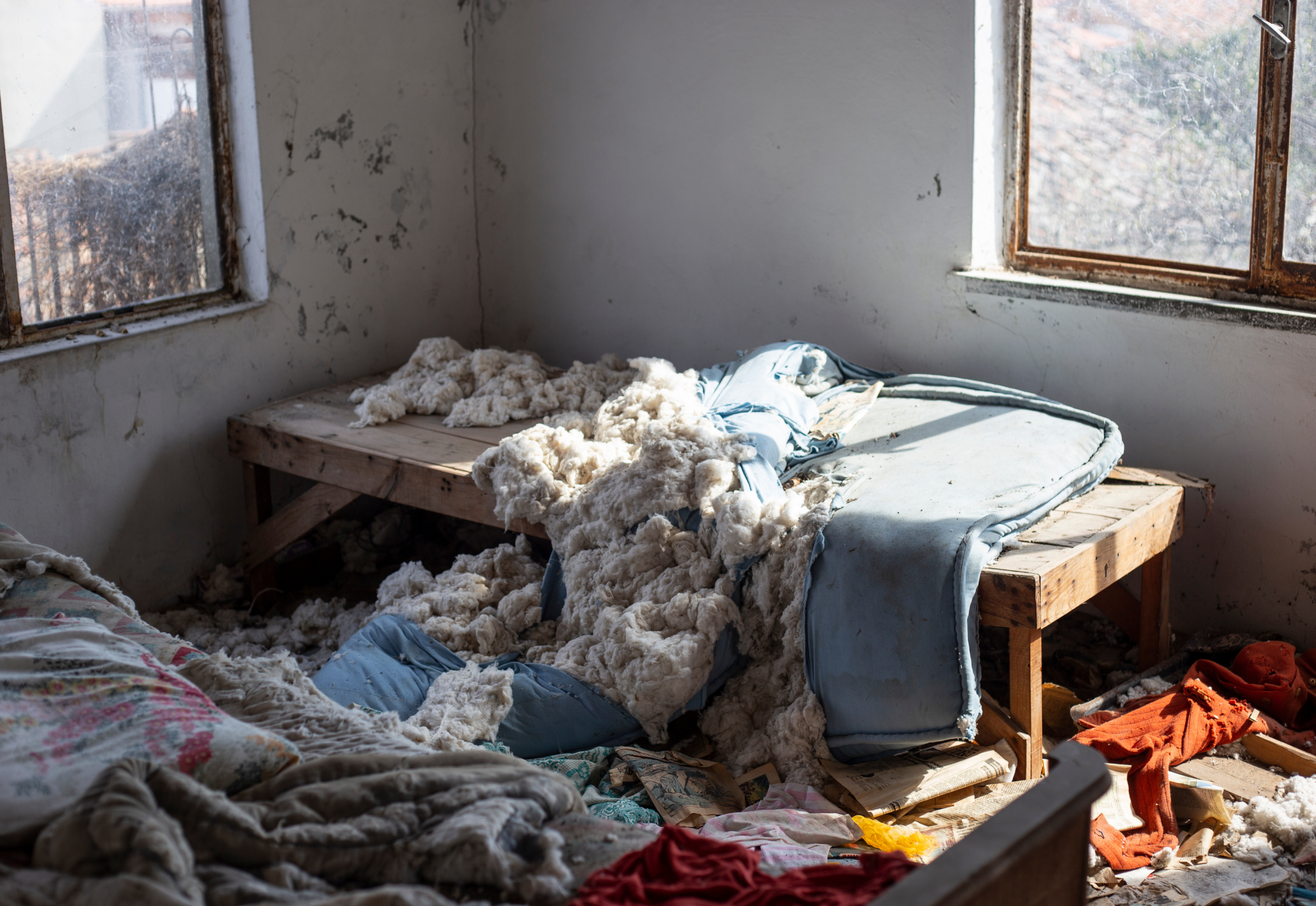 段ボール、紙袋、古い雑誌、チラシ。衣類の山、布団、毛布、カーペット。