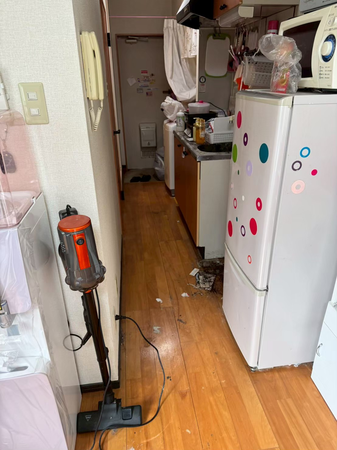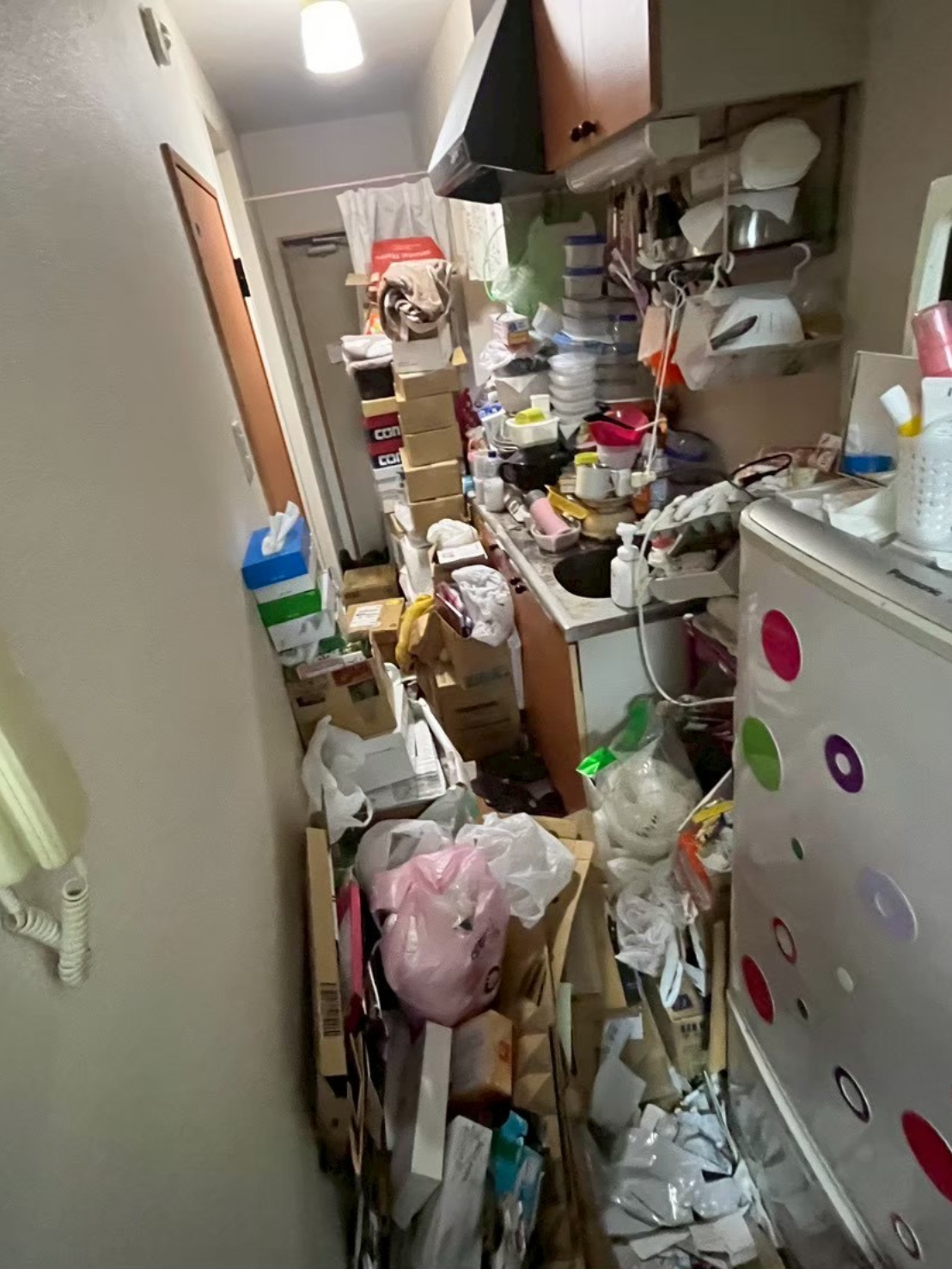 お部屋は1Kで、床一面にゴミや生活用品が堆積し、通路の確保も難しい状態でした。